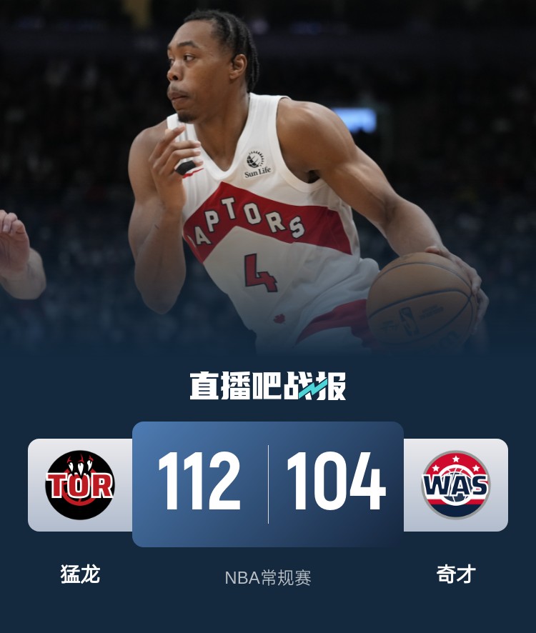 开场后萨尔迅速进入状态帮助奇才先声夺人,珀尔特尔内线接连拿分为猛龙追赶比分,普尔帮奇才将领先优势扩大,猛龙轮换阵容持续追分。第二节双方经过半节纠缠后猛龙利用奇才的失误连续打出反击将比分反超。易边再战,奎克利和珀尔特尔联手打出攻势巩固优势,普尔接连开火独得8分又将比分追上。最后一节猛龙再度掌控住场上局面将比分拉开,最终猛龙112-104击败奇才结束4连败,奇才遭遇5连败。