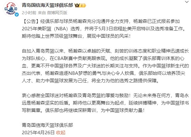 4月26日讯 今天,青岛男篮官方发文对杨瀚森做出了感谢,并表示将全力为他的选秀之路提供保障。
