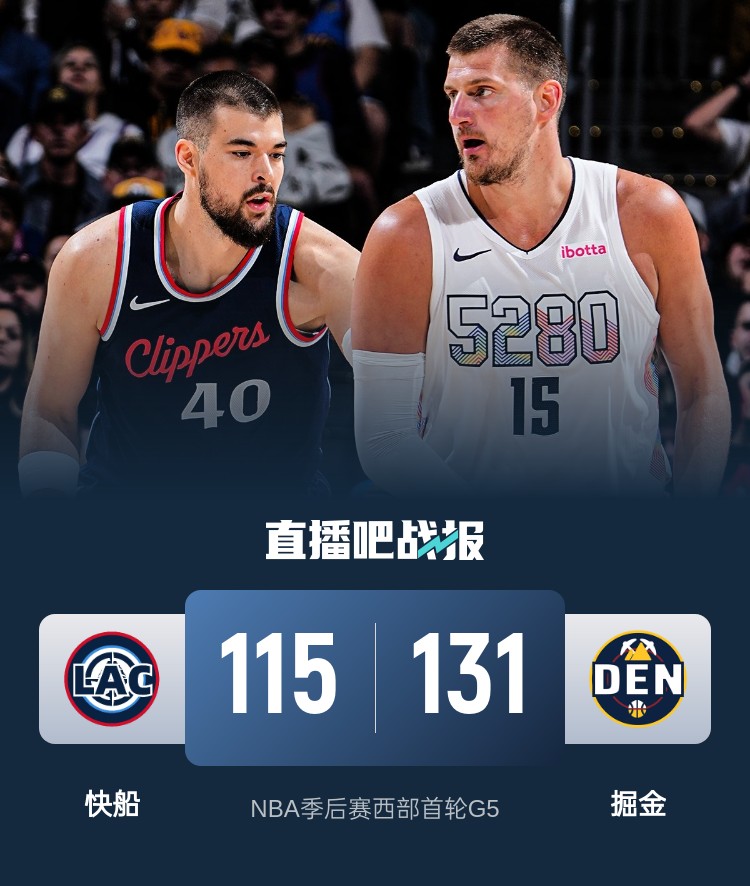 快船(2-3):祖巴茨27分5板1助2帽、莱昂纳德20分9板11助2帽、博格达诺维奇18分3板5助、邓恩15分2助2断、鲍威尔12分4板3助、哈登11分8板5助2断、德里克-琼斯7分1板、科比-布朗3分、乔丹-米勒2分、巴图姆6板2助2帽、西蒙斯1板、尤班克斯1板