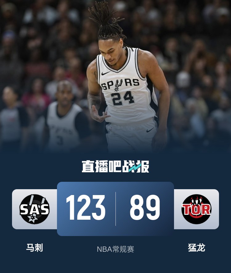 首节对决马刺仅仅和对手拉锯半节时间就完全接管比赛,后半段猛龙在长达6分50秒里仅得6分,马刺则内外花花轰出一波25-6的攻势直接在第一节就拉开20分的巨大分差;次节猛龙虽然回归整场但无力缩小分差,马刺依靠首节建立起的优势半场拿到22分的领先。休息归来马刺延续攻势继续拉大领先,第三节再胜12分的情况下分差拉大至34分早早杀死比赛悬念。最终,马刺客场大胜猛龙拿下比赛。