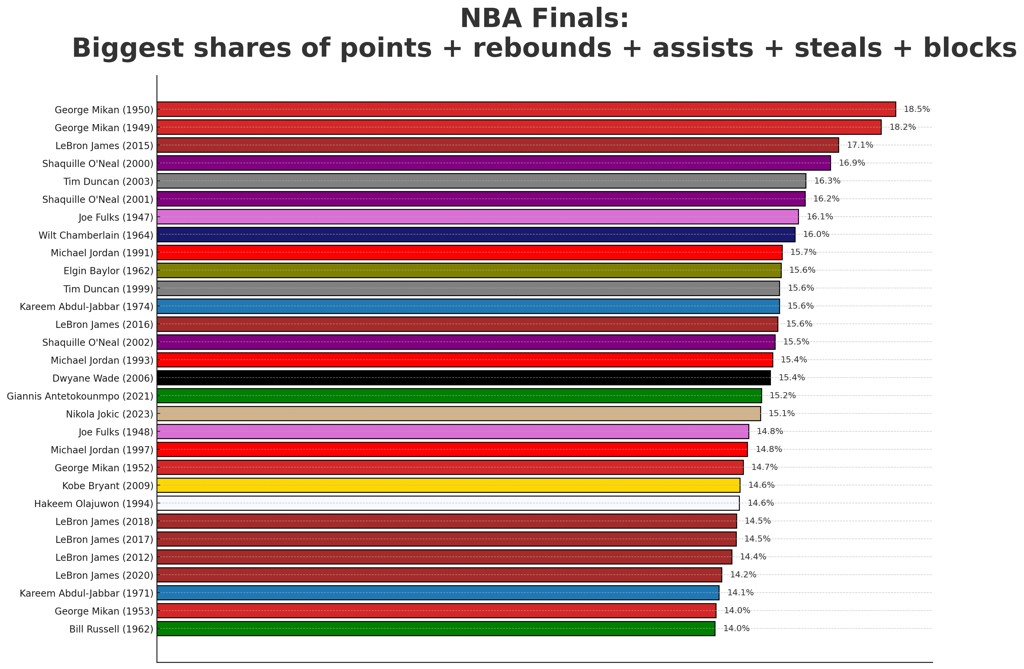 05月28日讯 今日,媒体HoopsHype统计了NBA历史上总决赛综合贡献值(得分+篮板+助攻+抢断+盖帽)排序: