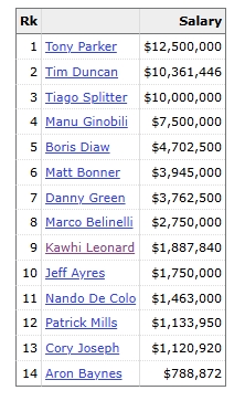 据ESPN名记Shams此前报道,亚历山大4年2.85亿美元和雷霆提前续约,后续薪资网站Spotrac表示由于工资帽涨幅不如预期,因此这份新约是4年约2.72亿美元,平均年薪是6810万美元;而2013-14赛季马刺全体队员的总薪资是6350万美元,其中薪水最高的是托尼-帕克(1250万美元),随后是邓肯(约1036万美元)和斯普利特(1000万美元),小卡约189万美元。