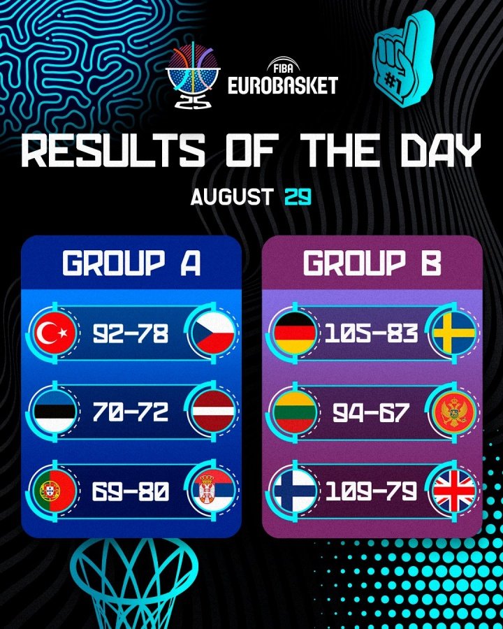 08月30日讯 男篮欧锦赛第三日六场比赛全部结束。赛果如下: