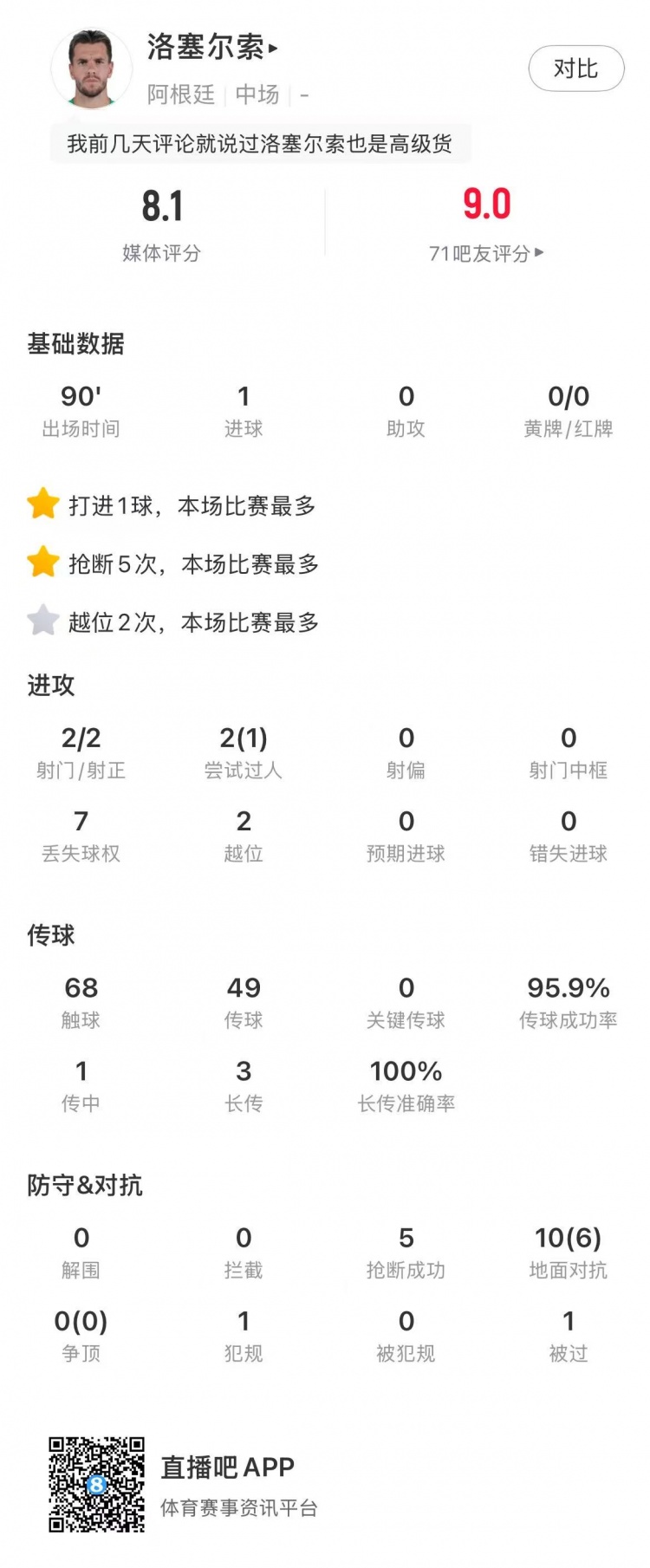 ■洛塞尔索本场比赛数据: