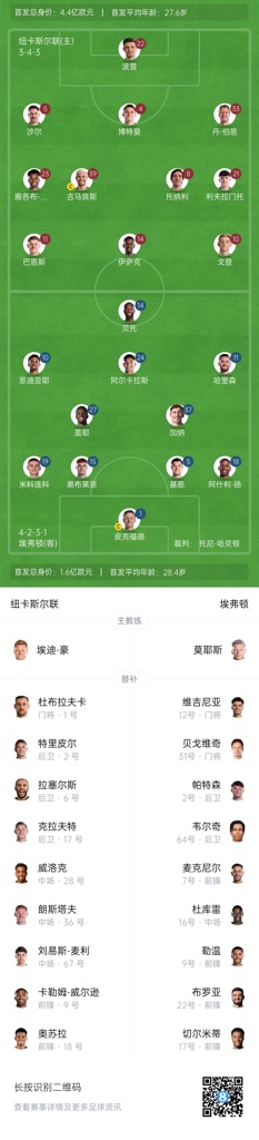 纽卡斯尔首发:22-波普、4-博特曼、5-沙尔、21-利夫拉门托、33-丹-伯恩、8-托纳利、10-戈登、39-吉马良斯、11-巴恩斯、14-伊萨克、23-雅各布-墨菲