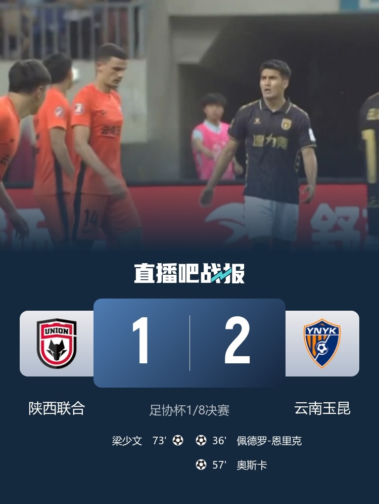 6月21日讯 北京时间6月21日晚上19:00,足协杯1/8决赛,陕西联合坐镇渭南体育中心体育场迎战云南玉昆。上半场,奥斯卡失良机后中框,恩里克头槌。下半场,奥斯卡推射建功,梁少文飞身破门.全场结束,陕西联合1-2云南玉昆。云南玉昆晋级足协杯八强!