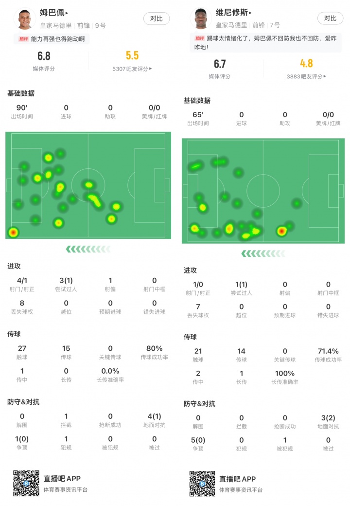 姆巴佩和维尼修斯的数据也解释了大部分皇马球迷对他们的不满。姆巴佩在世俱杯首次首发中踢满90分钟,却仅完成12次传球、1次过人,丢失了8次球权,并且在他与老东家的重逢中,甚至未能获得一次对手对他的犯规。他仅尝试一脚射门,并且在参与的5次对抗中只赢下了1次。