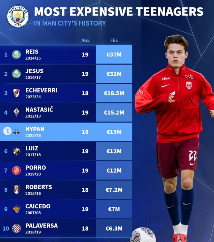 7月18日讯 曼城已经官宣签下18岁挪威中场天才尼潘,数据统计显示他也是曼城队史第5贵的U20球员。