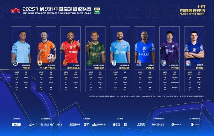 附中超7月最佳球员候选人数据: